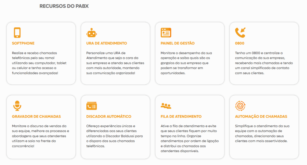 A telefonia oferece diversos recursos como identificador de chamada, encaminhamento de chamada, bloqueio, chamada em espera, correio de voz e URA.